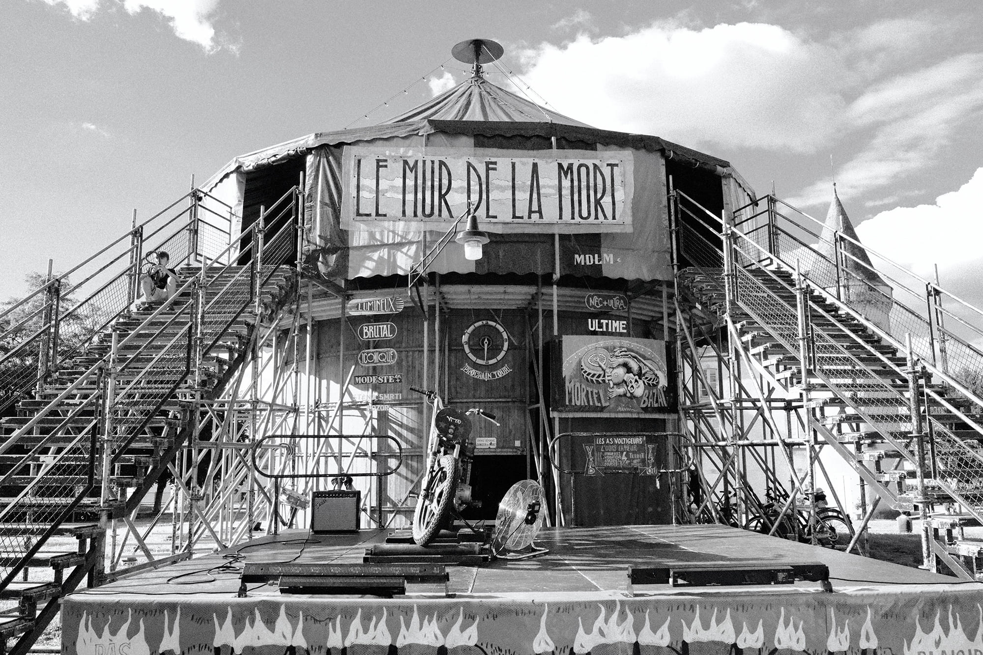 Appelez-le comme vous voulez : tonneau, puits de l’enfer, tourbillon mortel, cylindre infernal, cuve diabolique, silodrome, motodrome… L’important, c’est qu’il donne la frousse ! Inventé au début du 20e siècle, le « Mur de la Mort » permet à des motard·es bien allumé·es de rouler à tombeau ouvert et à la verticale. Avec Mortel Jus de Mortel, la folle équipée vous propose un mélange de rock live et de deux-roues pétaradants, à admirer d’en haut, « comme à l’époque ». Le tout livré avec humour et amour du risque. Chair de poule garantie !